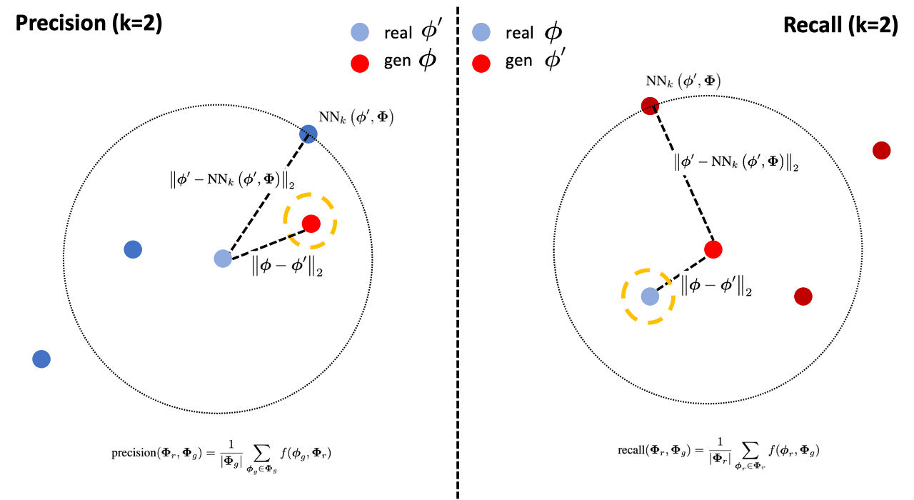Recall은 diversity를 의미하고, 이는 $P_{g}$에 포함된 $P_{r}$의 개수와 같다. 그 말은 가짜 집합에 포함된 실제 이미지의 개수를 의미하고, 가짜 집합의 범위가 넓을 수록 더 높은 값을 가지게 된다.