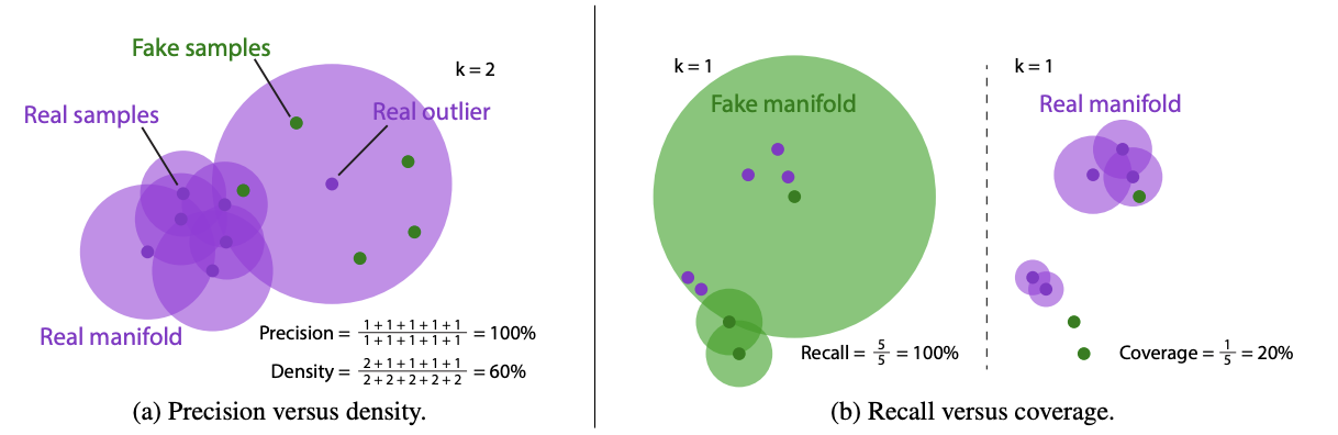 앞에서 설명한 측정 방식인 Precision and Recall을 개선하기 위해 Density and Coverage 라는 측정 방식을 추가했다.