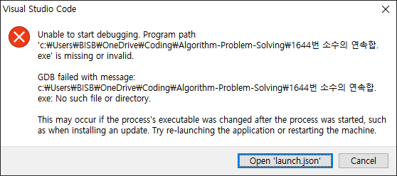 발단 원래는 CodeRunner로 알고리즘 문제를 풀고 나서 실행했는데 디버깅 기능이 없어서 불편했다 이후 CodeRunner 없이도 Vscode로 설정하면 디버깅과 디버깅 없이 실행이 가능하는 것을 알게되고 나서, 디버깅 설정을 하고 실행하려 했으나 아래와 같은 오류가 발생했다. 원인 VScode에서 launch.json파일을 수정하라고 요구하는 것을 보아, 이는 gcc의 컴파일 빌드 단계가 아니라 gdb 실행 단계에서 발생하는 오류로 추정된다. 발생 원인은 VScode 에서 한글 파일명을 인식하는데 문제가 있어 발생하는 오류로 보인다. 실제로, test.cpp 코드를 실행할때는 아무 문제 없이 실행되었다. 이 문제의 원인을 예로 설명해보겠다. 소스코드.cpp 파일을 Vscode가 g++를 이용하여 컴..